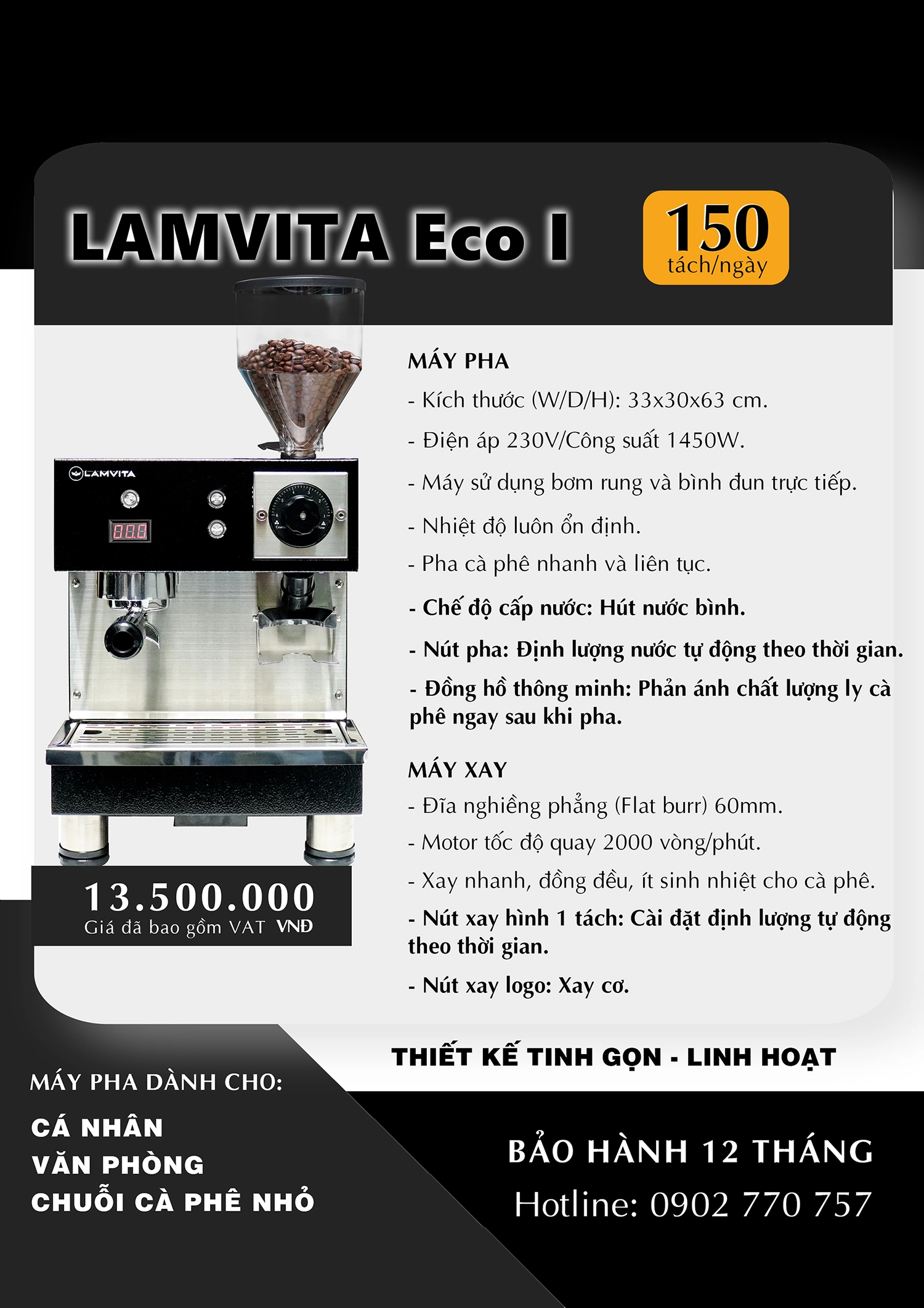 - Sự kết hợp hoàn hảo giữa máy pha cà phê và máy xay trong cùng một thiết bị mang đến cho LAMVITA Eco sự linh hoạt và tinh gọn, điều mà các mô hình cà phê to go luôn tìm kiếm.